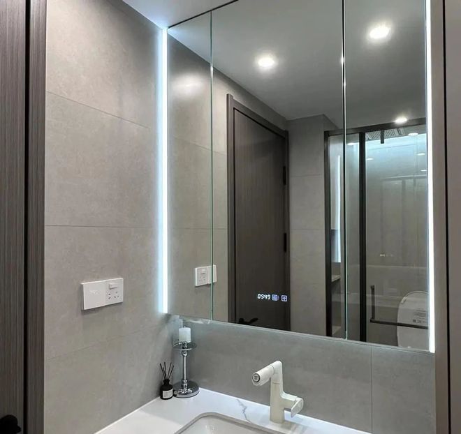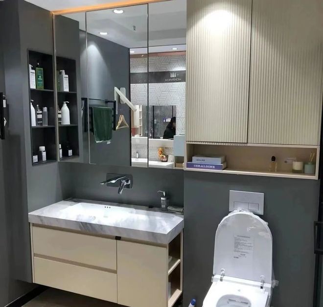 镜柜,大家都知道,是与洗漱台对应的。这个镜柜,挂在台面的上面,建议大家做到顶的镜柜,收纳空间会大。镜柜底部,做成一个无底柜,可以收纳更多的物品。