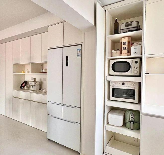 而在厨房橱柜的侧边,可以做一个到顶的高柜。高柜内部,设置成抽拉层板。当然,也可以设置成开放格,用来收纳家里的电器。