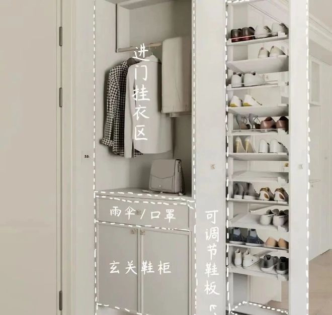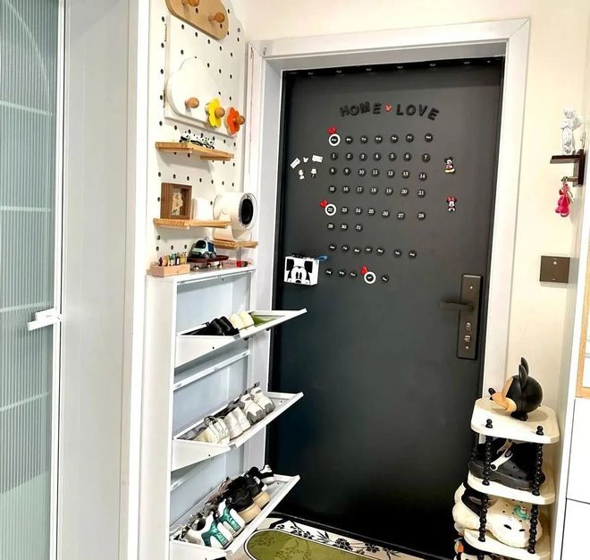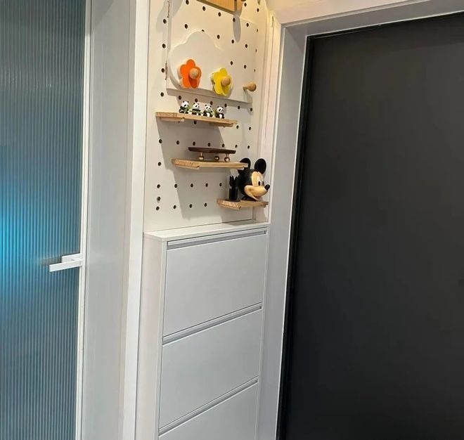 我看到这户人家的玄关,入住了6年,还跟新装修的一样。其做法,就是玄关挂衣区+超薄柜+洞洞板。