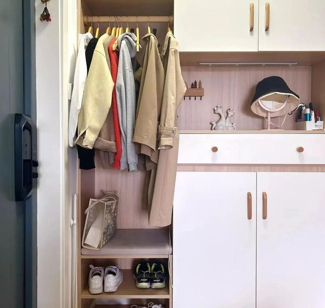 这个挂衣区,作用非常的大。每次进门,脱下来的外套,顺手就可以挂在这个挂衣区上。然后,就可以坐在下面的换鞋凳上换鞋。