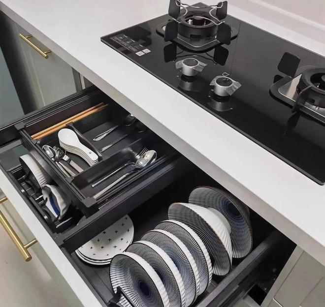 厨房拉篮,主要是用来收纳我们家里碟子碗的。这户人家设置了两个大抽屉的拉篮。