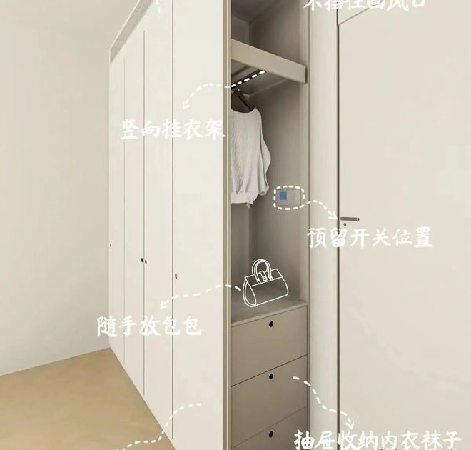 挂衣区,是在衣柜的侧面做的侧面收纳格。这个侧面收纳柜,上面是长衣区,下面是收纳箱。