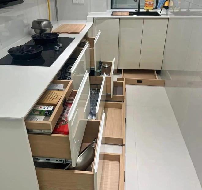这户人家厨房的地柜,几乎没有做一个柜子,都是使用的抽屉。抽屉,分成了不同的类型,收纳不同的物品。